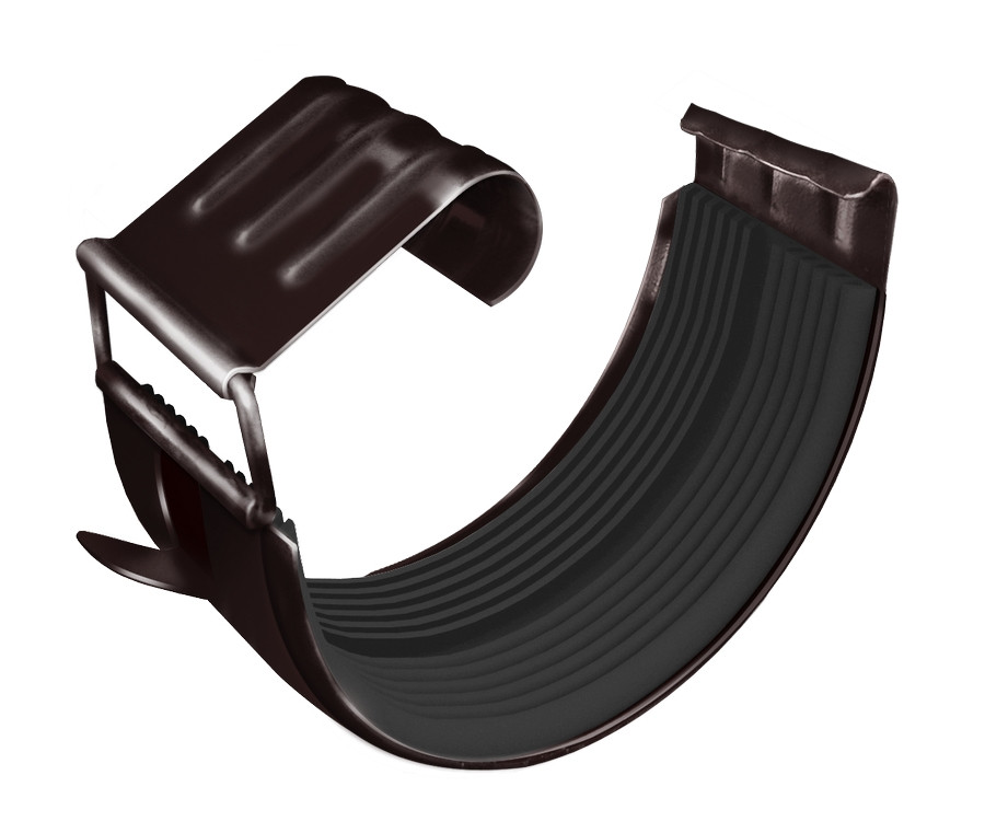 Соединитель желоба в комплекте предназначен для последовательного соединения двух желобов, либо желоба и угла (внешнего или внутреннего). Предотвращает протекание воды в местах соединений и является компенсатором линейного расширения металла. Имеет полноценный резиновый профиль, благодаря которому не требует мер по дополнительной герметизации. Наличие универсального замка (пряжки) позволяет использовать его многократно и исключает возможности его поломки при частом открытии или закрытии. Наличие ребра жесткости придает детали дополнительную прочность. Соединитель желоба поставляется в комплекте с элементом жесткости, который представляет собой трубку из оцинкованной стали, либо из меди, толщиной 0,7 мм, которая по своей конструкции повторяет завиток желоба. С помощью элемента жесткости на 50% увеличивается жесткость конструкции в местах соединения желобов, что упрощает работу по расчету и установке водосточной системы, а также не требуется установка дополнительных крюков в местах стыка желобов (стыковку желобов можно производить в любом месте, вне зависимости от шага крюков).