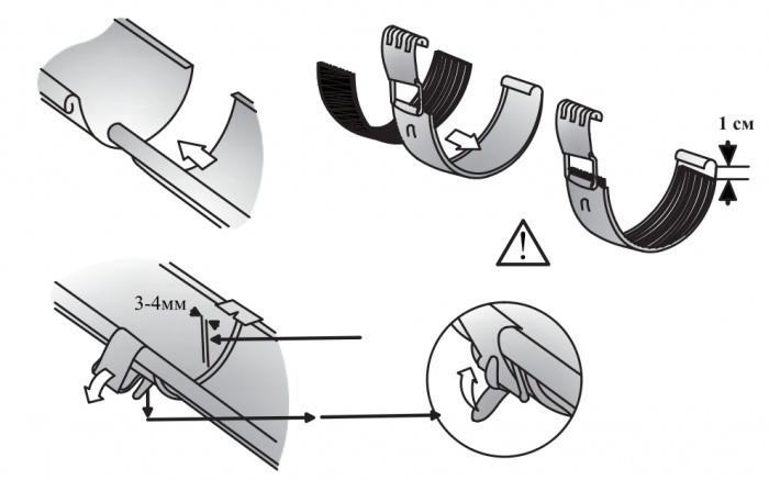 - Для соединения желобов между собой и с углами желоба вставьте их друг в друга с нахлестом в 60-90 мм, предварительно отогнув кромку нижнего желоба.