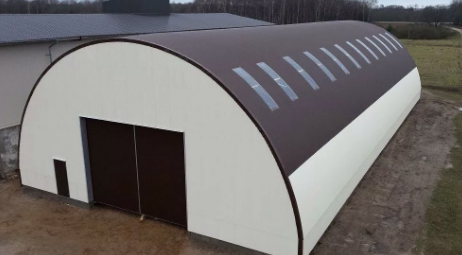 Зернохранилища, фермы, выставочные павильоны, склады, ангары и другие промышленные сооружения часто имеют сводчатую конструкцию — это снижает ветровую нагрузку и удешевляет строительство. Для возведения таких строений обычно используют арочный профнастил самонесущий Н112ПГ для бескаркасных ангаров.