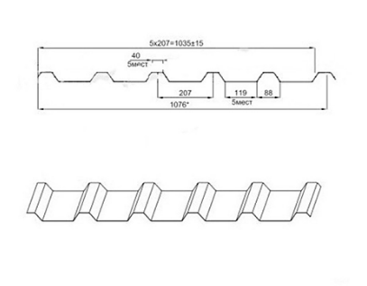Для профлиста МП35ПГ характерен выраженный трапециевидный профиль. Окончательный вес листового материала зависит от толщины стали, количества слоев покрытия, метража. В среднем показатель массы варьируется в пределах 5,019-8,643 кг.