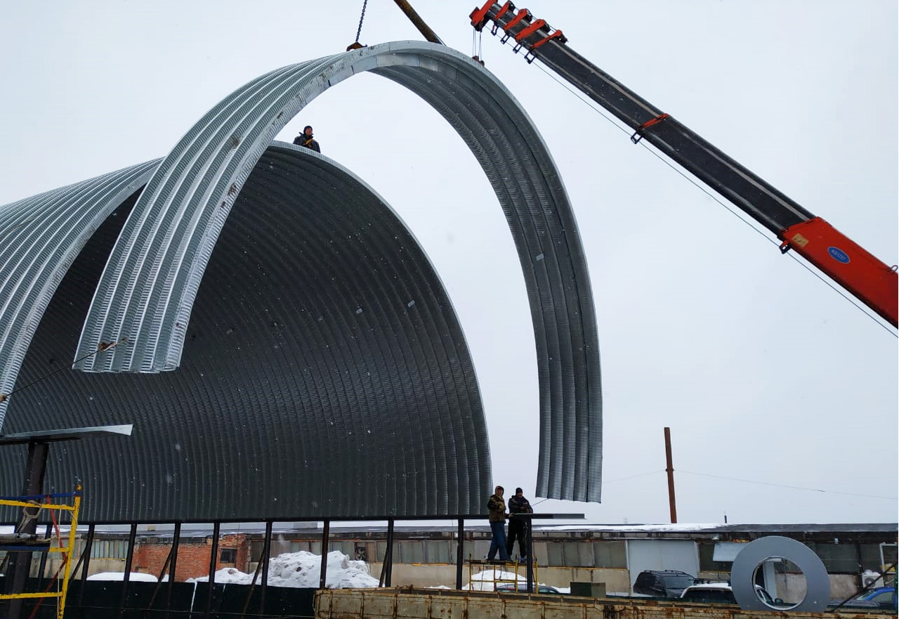 • Далее, с помощью крана секции, арки устанавливаются на фундамент и крепятся к специальным защёлкам, вмурованным в него.