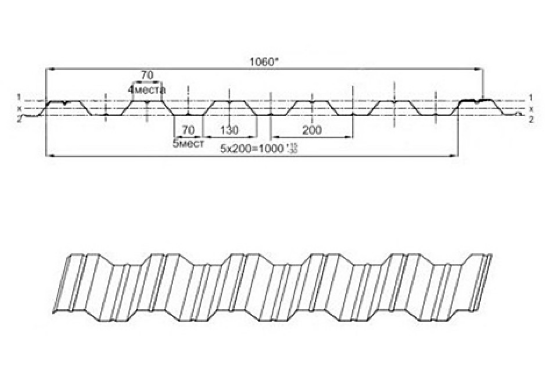 - На каждой волне трапеций с обеих сторон профлиста НС35ПГ есть дополнительные ребра жесткости. Это обеспечивает изделию хорошую несущую способность.