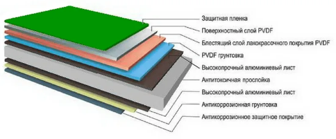 - ПВДФ - полимерное покрытие металлического листа Имеет матовую полуматовую поверхность. Это покрытие обладает хорошей устойчивостью к прямому ультрафиолетовому излучению, низкой грязеудерживающей способностью, высокой стойкостью к механическим повреждениям. Небольшая толщина этого покрытия (27 микрон), позволяет наносить его по толстослойным полиэфирным грунтовкам.