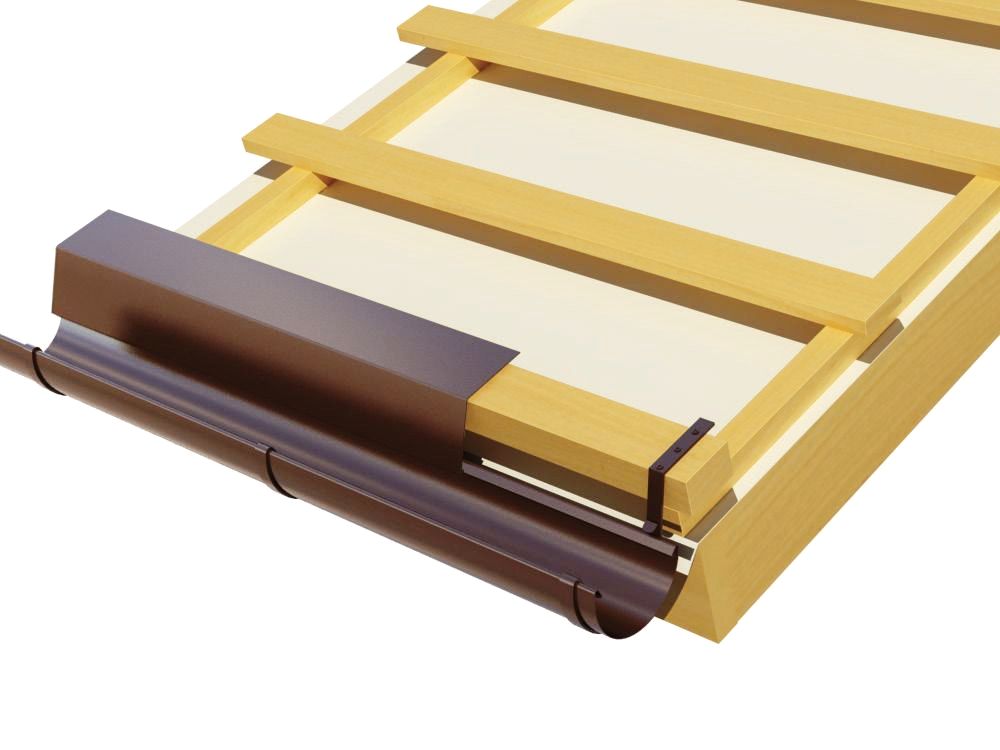 Капельник, в отличие от карнизной планки, выводится под водосточный желоб, а не в него. Поэтому в нижней части он не прилегает к брусу, а свешивается с него, чтобы как можно меньшее количество влаги попадало на лобовую планку.