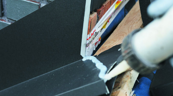 4. Проводят изоляцию мест, где торцевая планка соприкасается с кровлей, используя саморасширяющуюся ленту или герметик. Это не допустит попадания насекомых и пыли в подкровельное пространство.