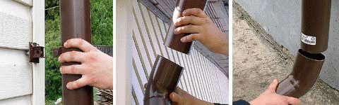 • Труба монтируется вертикально, а ее нижний конец находится на высоте 25 см от земли или 15 см от отмостки. Для крепления к стене с помощью дюбелей устанавливаются держатели (кронштейны). Аккуратный охват и удержание трубы обеспечивают хомуты. Шаг крепления обычно составляет 1 м. При необходимости стыка двух труб применяются соединительные муфты. В месте стыка монтируется два держателя. Хомуты затягиваются плотно, но не деформируют трубу.