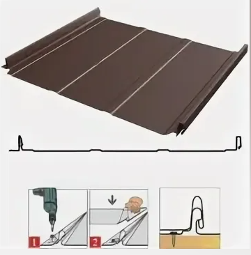 Металлические листы с фальцами укладываются на гидроизоляцию и соединяются между собой специальными крепежными элементами.