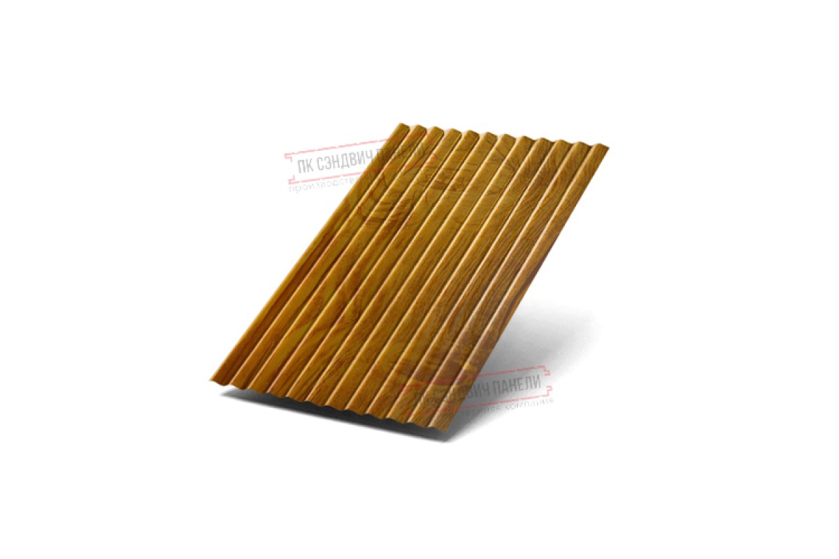 Профилированный лист МП18х1100 ECOSTEEL_T-ЗолотойДуб-0.5 широко применяется в Кронштадте для обустройства фасада. Изначально он представляет собой металлический оцинкованный лист толщиной 0.5 мм с покрытием. После проката на специальном оборудовании сталь приобретает рисунок из повторяющихся волн. Такая форма придает профилю несущую способность.