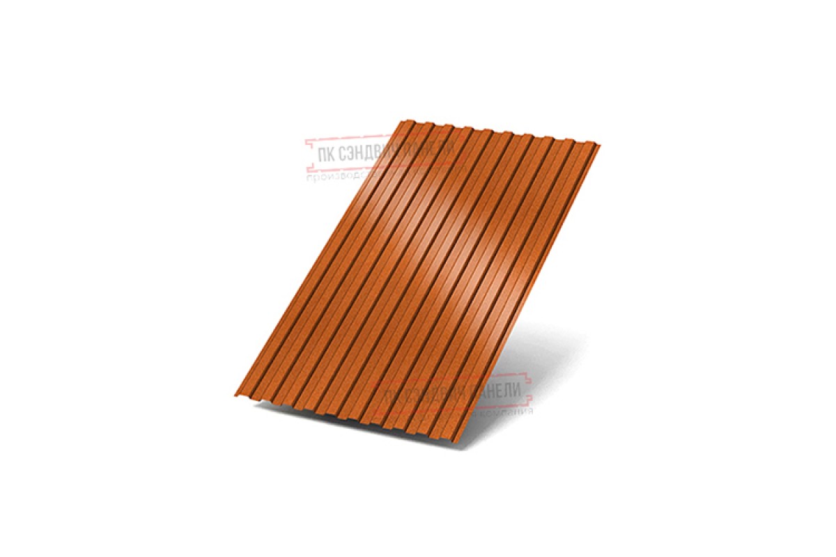 Профилированный лист С8х1150 AGNETA-CopperCopper-0.5 представляет собой холоднокатаные стальные листы толщиной 0.5 мм, обработанные декоративно-защитным покрытием Агнета двухсторонний. Профилированный лист С8х1150 AGNETA-CopperCopper-0.5 — оптимальный материал для облицовки фасада в стиле хай-тек. Профилированный лист С8х1150 AGNETA-CopperCopper-0.5 пользуется спросом в Кронштадте, поскольку он экономичный и неприхотливый. При выборе профнастила обращайте внимание на рельеф: чем он выразительнее, тем жёстче материал. С8 – самый низкий и весьма недорогой профиль. Его способность противостоять большим нагрузкам относительно невелика, поэтому данный профнастил не применяется в конструкциях, где необходима высокая прочность. Как правило, С8 используют в качестве стенового облицовочного материала, а также для строительства заборов и монтажа потолков. Обладая маленькой высотой – всего 8 мм – он вместе с тем имеет самую большую рабочую ширину – 1150 мм. Чаще всего на изготовление С8 берётся стальной лист толщиной от 0,4 до 0,7 мм. Это подходящие толщины для обшивки фасадов или установки ограждений в климатических зонах с низкой ветровой нагрузкой. Для вспомогательных конструкций туалетов, бытовок, сараев, времянок в Компании Профлист Панель можно купить профнастил без полимерного покрытия толщиной 0,35 мм, чтобы сэкономить, когда есть необходимость.