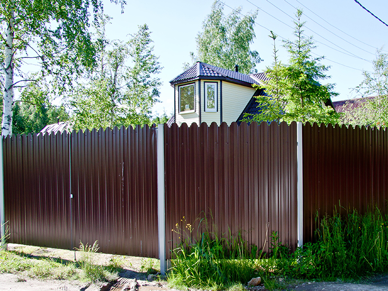 На стоимость готового забора из фигурного профлиста влияет высота забора, размер огораживаемого участка, количество лаг, тип фундамента и количество дополнительных элементов.