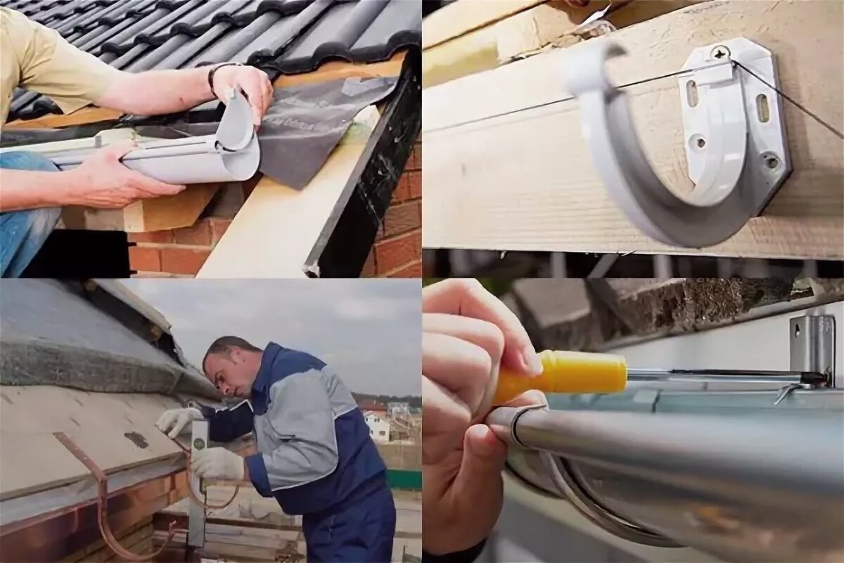 Монтаж желобов водосточной системы.